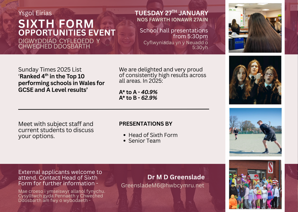 Ysgol Eirias is a centre of excellence in learning where everyone is encouraged to reach their potential. We endeavour to equip the members of our school body with the confidence and skills to enable them to make a positive contribution to the world of work and in our local and wider community.
